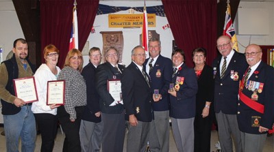L to R: Dave Murphy, Cindy Roberts: Certificate of Appreciation; Pat Oland: Treasurer Bar; Nancy Leach: Secretary Bar & Executive Medal; Cathy MaCabe: Executive Medal and Bar and Certificate of Merit; Pat Perry: Executive Medal & Membership Bar; Terry Morgan, Helene Hahn: Branch Service Medal; Diane Best: Certificate of Merit, Bill Wels: Honours Committee; Bob Howell: Honours & Awards Chairman.