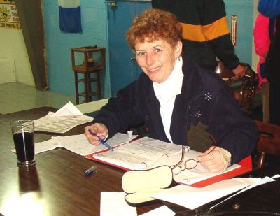 Shirley Barker, seen here working hard tabulating the Bonspiel results, received her Life Membership at the banquet.