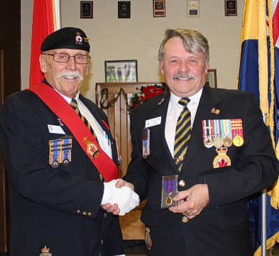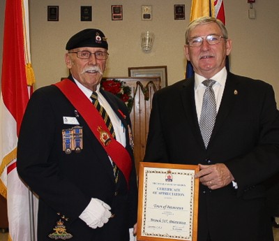 His Worship The Mayor of Petawawa Bob Sweet receiving a Certificate of Achievement on Behalf of the Town of Petawawa for Their outstanding support over the years, from Bob Howell Honours and Awards Chairman