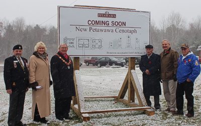 The official Grant from the Veterans Affairs was awarded to the Royal Canadian Legion Branch 517 and The Town of Petawawa for the new cenotaph on Saturday November 9, 2013. The cenotaph committee consists of: Bob Lescombe; Bob Sweet; Bob Howell; Bob McBride; Ralph Story; Kelly Russell, Kelly Williams, Ed Chow, and Glen Mohns. This was presented by The Honourable Cheryl Gallant to mayor Bob Sweet and the cenotaph committee in front of the legion.