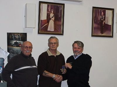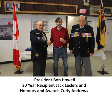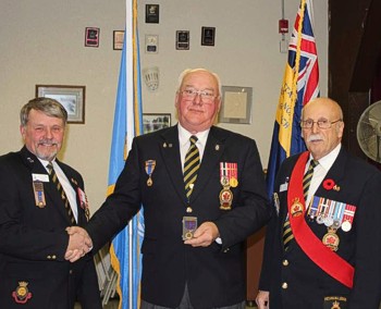 Honours and Awards Chair Bob Howell Left presenting 50 Year Medal recipient Phil Doucette centre and Right is Branch President Ralph Kendrick