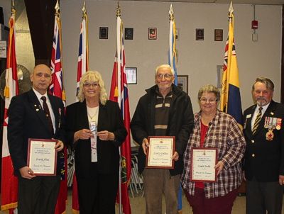 The picture shows from left to right: Legion President Bob Lescombe; The Hon. Cheryl Gallant; Mayor Bob Sweet; Ralph Story; Bob McBride, and Bob Howell.