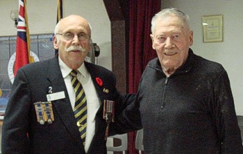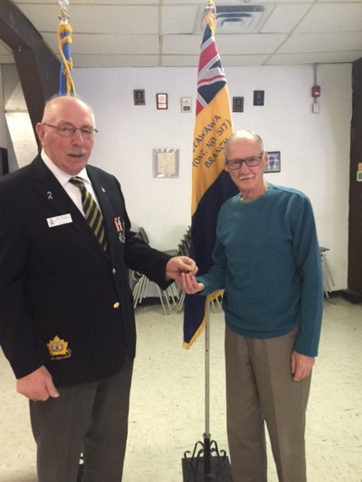 Gary Serviss, Co-op Coordinator Valour JK-12 School, presenting Comrade Bruce Westgarth with a replica of a brick that was placed on the wall at Normandy, France. Although Bruce is a member of Branch 72 he is a frequent visitor at our branch and a WWII Vet with distinction.